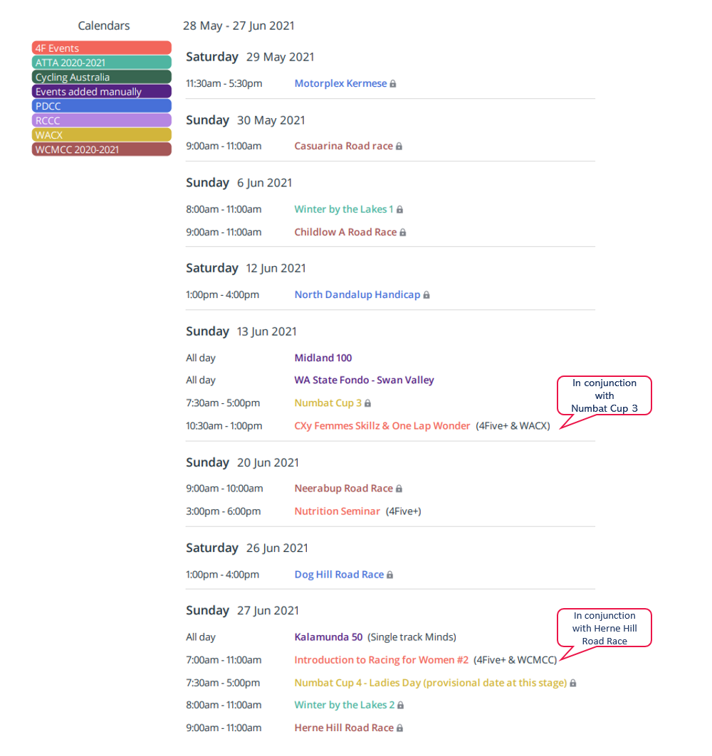 The 4F Committee are curating a WA Cycling online calendar. 4Five+ Members can access the live online version via the Members Area on the website.